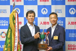 入間市手揉狭山茶保存会の間野さんが8月22日、同市の杉島市長を訪ね、「第33回全国手もみ茶品評会」で一等一席…