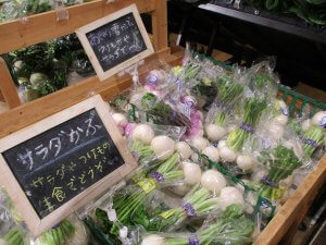 いるマルシェでは、生食で食べられるみずみずしい「サラダかぶ」や、ほんのり紫が美しい「アヤメ雪かぶ」などが店頭に…