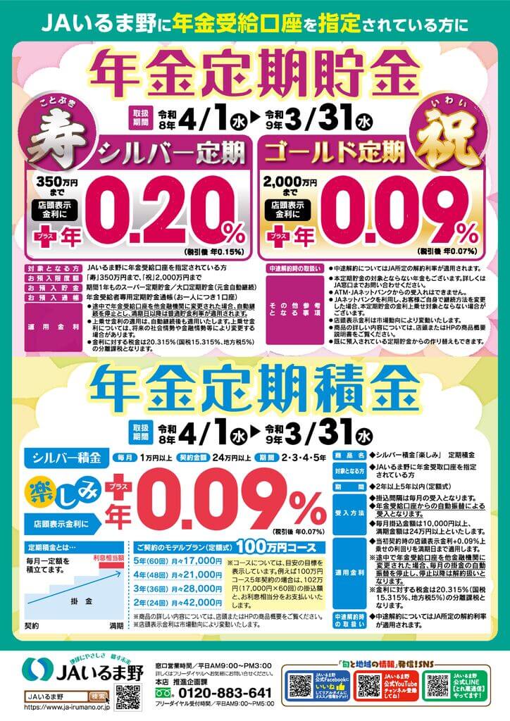 JAいるま野で年金をお受け取りになられている方専用の大変お得な定期貯金・定期積金です。