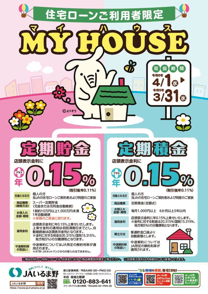JAいるま野で住宅ローンをご利用中の方向けの金利上乗せ定期貯金・定期積金です。