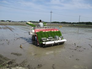 田植え作業が始まりました。耕耘及び代かき作業後、育苗していた水稲苗を田植え機で植えていきます。