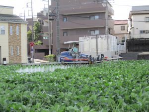 大豆圃場に病害虫が発生してきたため殺虫剤散布を行いました。