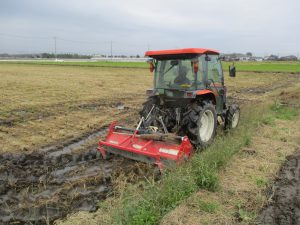 稲刈り後の田んぼ圃場の小麦播種準備としてフレールモアによる整地作業を開始しました。