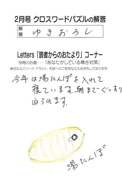 私の寒さ対策は朝風呂に入ることです。毎朝決まった時間に起床して、新聞を読んだり、お弁当を作ったりしていますが、起床後は寒くて思いのほか身体が動かないので、朝風呂に入ることにしています。ポカポカして朝の仕事がスムーズになります。