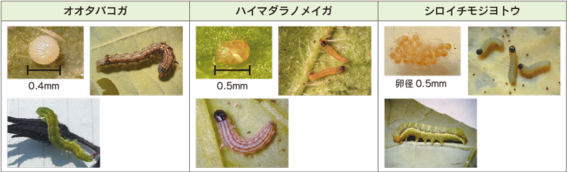 老齢幼虫は薬剤の効果が低下するため、薬剤散布は若齢幼虫のうちに行いましょう。また、幼虫が作物内に食入すると薬剤散布の効果が低下します。被害を確認したら直ちに防除しましょう。
