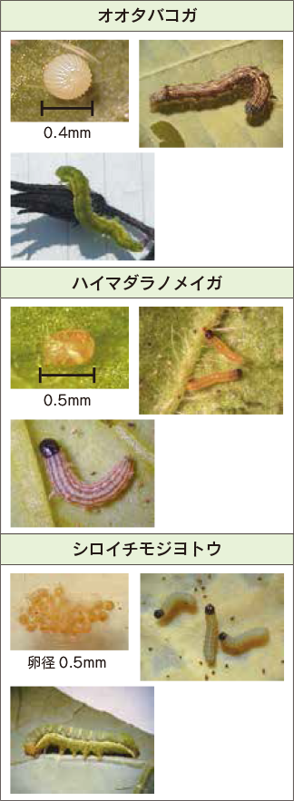 ナス、トマト等の果菜類や、キャベツ、ハクサイ等の結球内に入り食害し、被害を与えます。