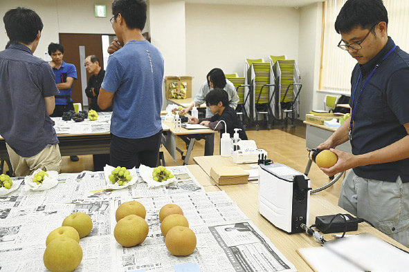 JAいるま野西部果樹部会は8月28日、飯能市のJA飯能支店でブドウと梨の糖度検定会を開きました。
