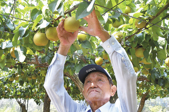富士見市で8月上旬から9月中旬頃にかけ、特産の梨が収穫最盛期を迎えました。富士見梨生産組合の田中正仲さんが経営する梨園でも、甘くみずみずしく育った「幸水」や「彩玉」、「豊水」、「秋月」が収穫され、軒先販売やJA農産物直売所に出荷されました。