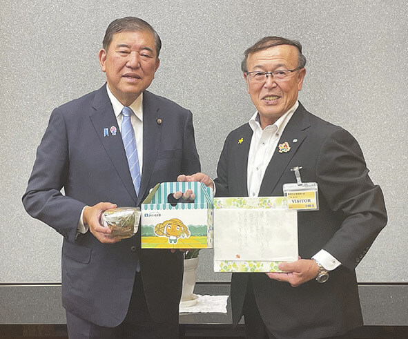 石破首相(左)に特産物を手渡す亀田組合長