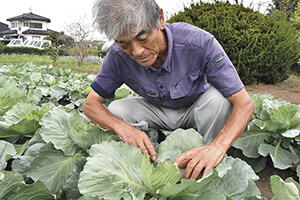 キャベツの生育状況を確認。食べる人の笑顔のため、