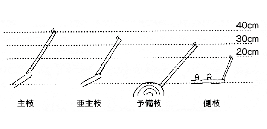 主枝の先端部が、他の枝に比べ地面から最も高くなるようにします。主枝が最も高く、亜主枝、予備枝、側枝の順に低くします。強く伸ばしたい枝ほど高く、果実を成らせる枝は低くすることがポイントです(図1)。