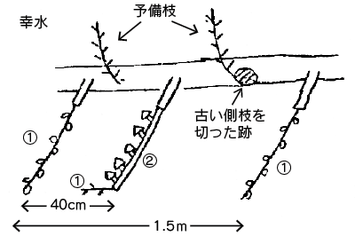 継続的に予備枝を準備し、側枝を更新できるように、枝を配置しておきます(図2)。