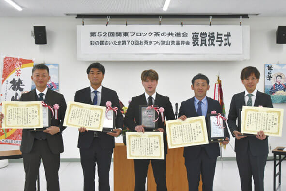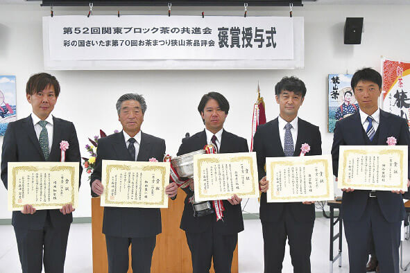 入間市の埼玉県茶業研究所で10月31日、9月に開催された「第52回関東ブロック茶の共進会」の褒賞授与式が行われました。最高位の農水大臣賞には、荒茶(普通煎茶)と仕上茶(普通煎茶)の両部で新井真一郎さん(所沢市)、荒茶(深蒸し煎茶)の部で丸イ西谷製茶・西谷祥治さん(静岡県牧之原市)が受賞し、表彰状を受け取りました。