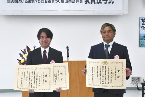 最高位の1等1席には、「仕上茶の部」で所沢市の新井真一郎さん(農水大臣賞)、「手もみ茶の部」では入間市の池谷英樹さん(県知事賞)が受賞し、表彰状を受け取りました。