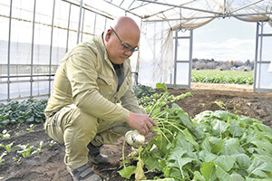カブの収穫作業。丁寧に育てた野菜を収穫する際の喜びはひとしおです。