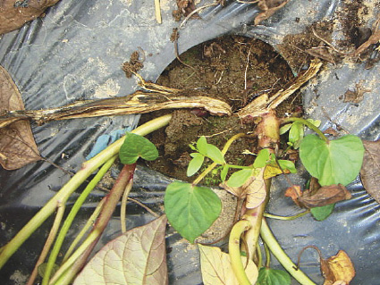 また、収穫期近くに発症した株では、つるの一部だけが枯れることもあります。こういった株では、つる割れ症状が、サツマイモのなり首にまで及ぶことがよくあります。枯死した茎の表面には、白色のカビを多数形成し、これが残渣とともに土壌中に残り、翌年の伝染源になります。