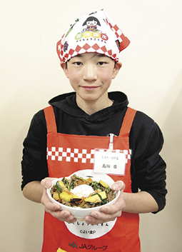 JAは2月22日、第18回こども料理コンクールを開きました。18作品の応募の中から三芳町の島田尊さんが作った「野菜たっぷりプルコギ丼」がJAいるま野組合長賞に選ばれました。サツマイモを拍子切りにして焼いた後、ニンジンなどの野菜と調味料で味付けをした牛肉を混ぜ、蒸し焼きにして白米に乗せた一品です。