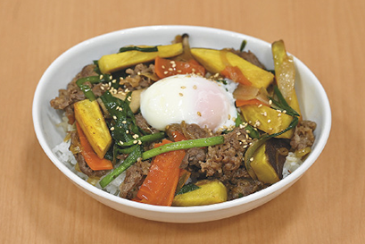 野菜たっぷりで彩りもよく、栄養・ボリューム満点のパワーフードです!地元で採れるサツマイモ「富の川越いも」の甘さとプルコギがマッチしています。美味しいお米の「彩のきずな」に乗せて食べてみてください!