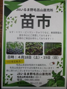 苗市ではJAいるま野毛呂山支店の女性部による大福の販売、また毛呂山支店による焼きそばの販売もございますので、ぜひ皆様お立ち寄りください。