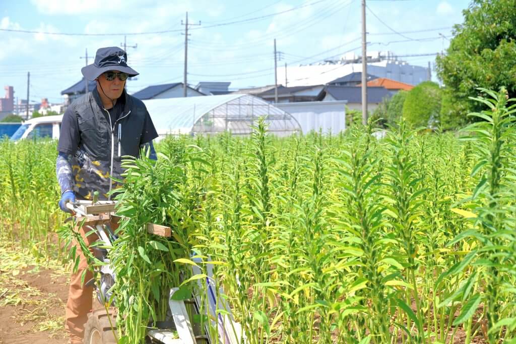 狭山市の豊泉さんは、夏場の収入源となる作物を探していたことや、当時JAで力を入れ始める作物であったことから、7年前に金ゴマの栽培に着手しました。6月上旬に種子を播き、9月2日から収穫を始めました。約15アールの畑で栽培しており、今年は例年並みの約100キロの収量が見込まれます。