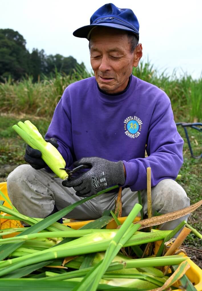 飯能市川寺の守田さんの畑で16日、マコモタケが収穫最盛期を迎えました。今年は窒素量を昨年より約1.5倍に増やすなど、栽培管理を徹底したおかげで株が太く、品質も良好です。根元が肥大した新芽を近隣農家と協力し、約70キロを手作業で丁寧に刈り取りました。