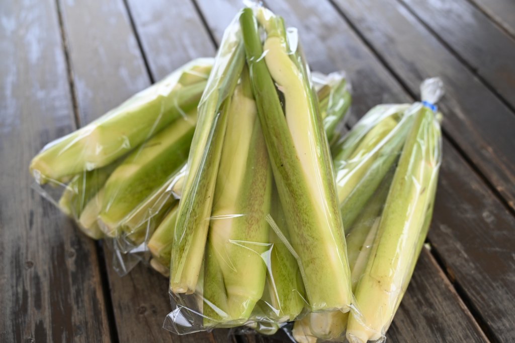 草取りや肥料散布、水管理などを行い、草丈約2メートル以上に育てた後、葉の部分と根元が肥大した新芽部分に切り分けます。