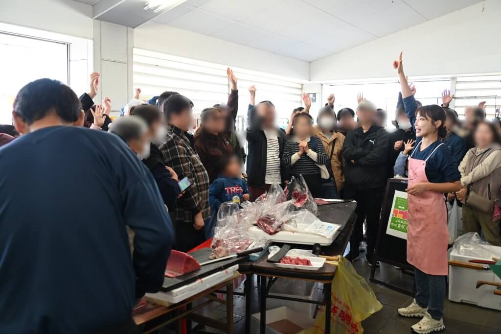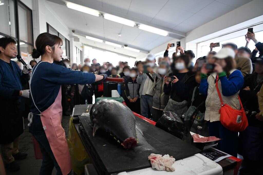 マグロは職人が大きな包丁で丁寧に切り分けた後、新鮮な切り身をその場で握り寿司にして来場者に振舞いました。カブトやカマなど希少部位はじゃんけん大会で勝ち抜いた方に配られ、会場は盛り上がりを見せました。