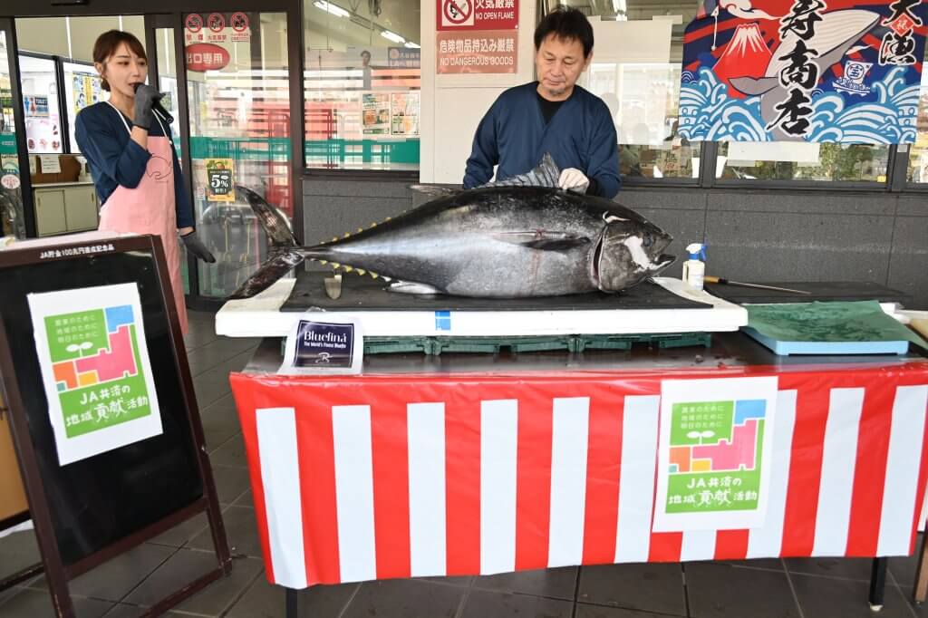 また、JA農産物直売所「あぐれっしゅ川越」ではスペシャルイベントとしてJA共済連埼玉県本部の地域・農業活性化積立金を活用した「マグロ解体ショー」が行われました。迫力満点のマグロに来場者は「こんなに目の前でマグロ解体ショーを見るのは初めて!」と笑顔を見せました。