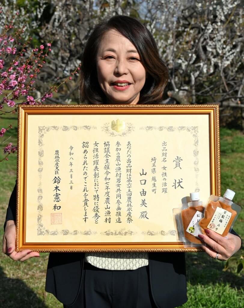 越生町で「山口農園」を営む山口さんは3日、2025年度の農山漁村女性活躍表彰の「女性地域社会参画部門(個人)」で最優秀の農水大臣賞を受賞しました。日本初の「全国ウメ生産者女性サミット」の企画・主催や、企業と連携した「越生の梅」のブランド化と知名度向上への貢献などの活躍が評価されました。