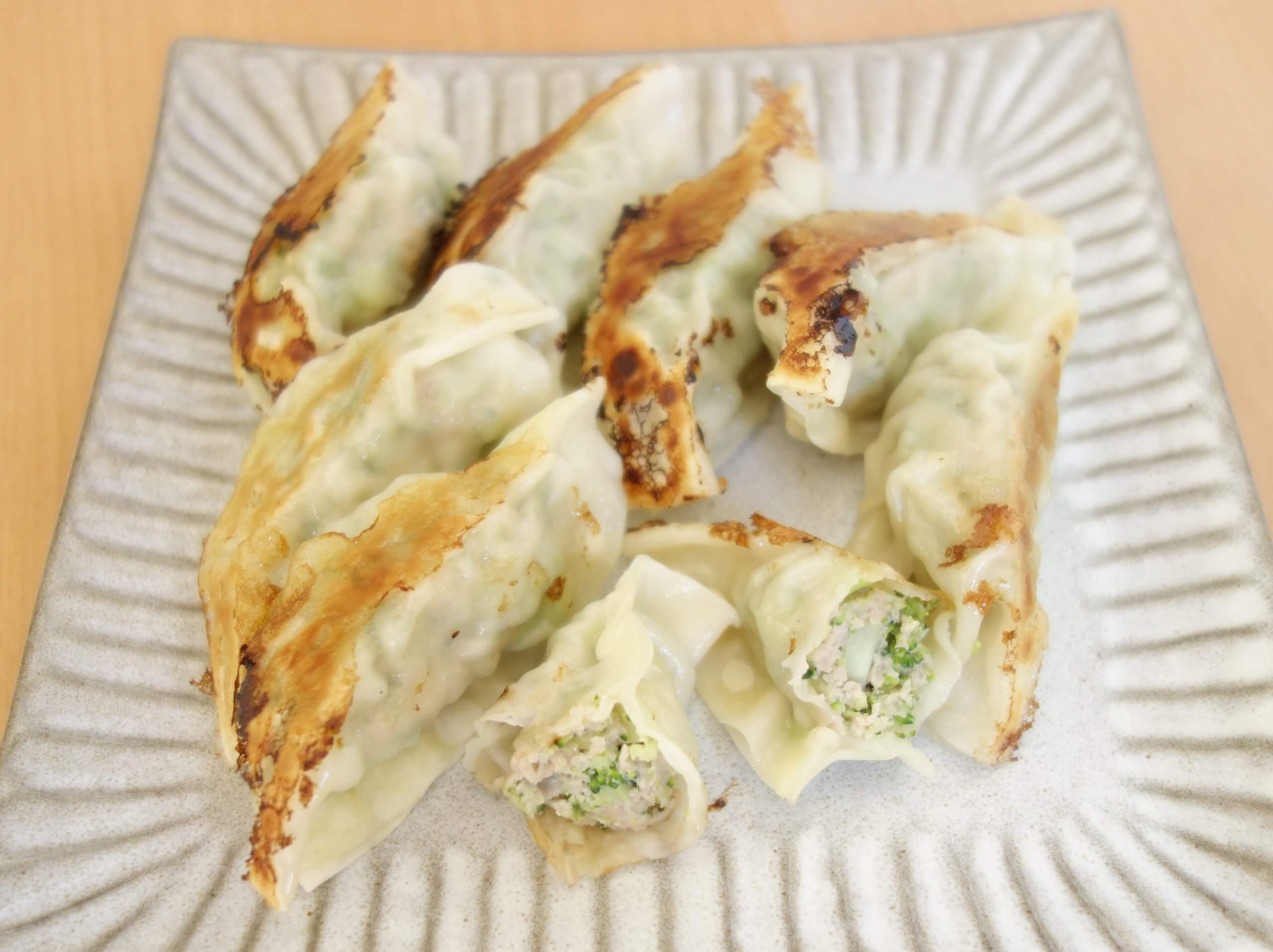 - 餃子の皮に②を大さじ1くらいのせて、縁に水を付けて、片側にひだを寄せながら包む。