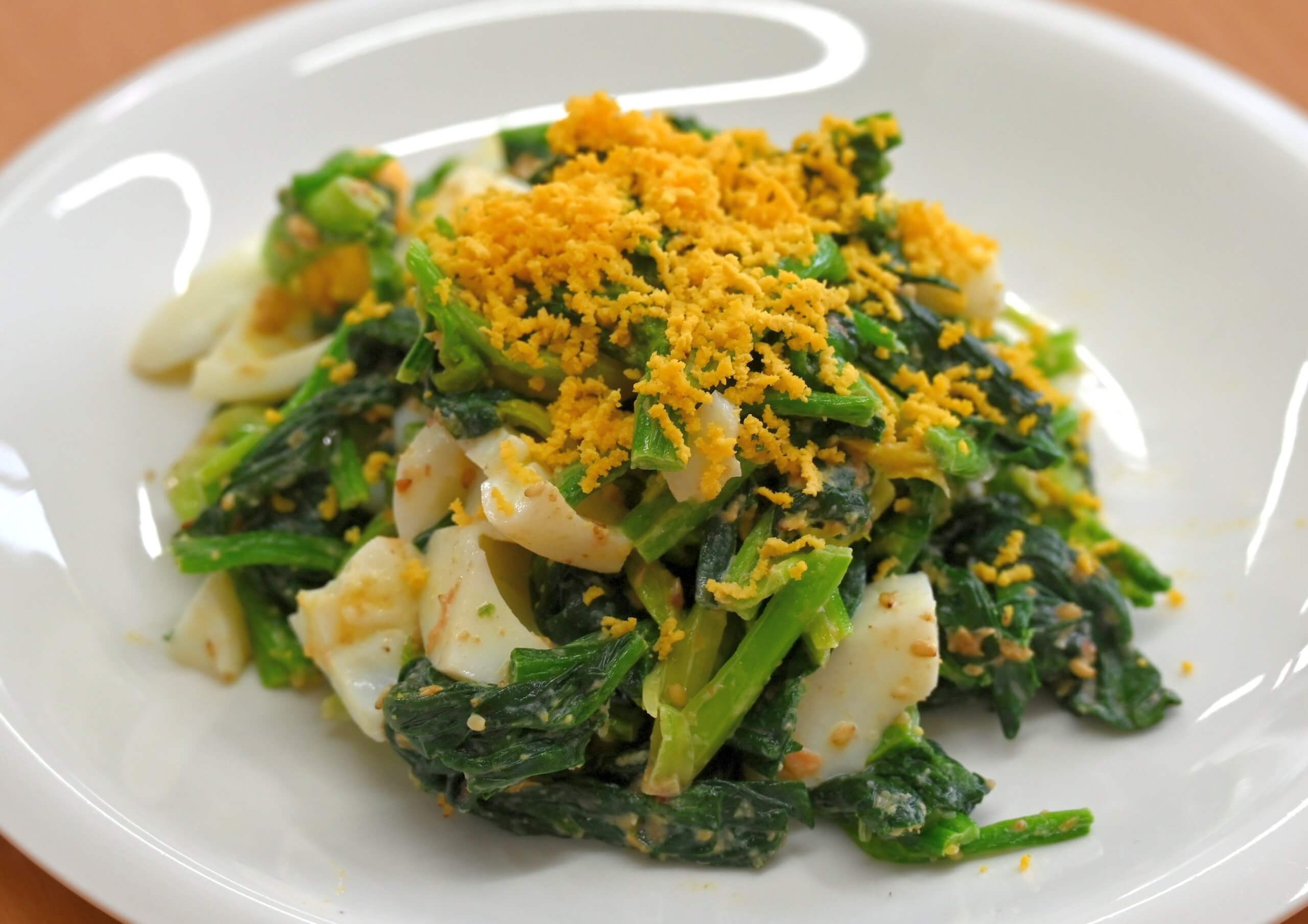- ホウレンソウは根に切り込みを入れる。よく洗い、塩を少々入れて茹で、冷水で冷まし、水気を絞る。3~4㎝の長さに切る。