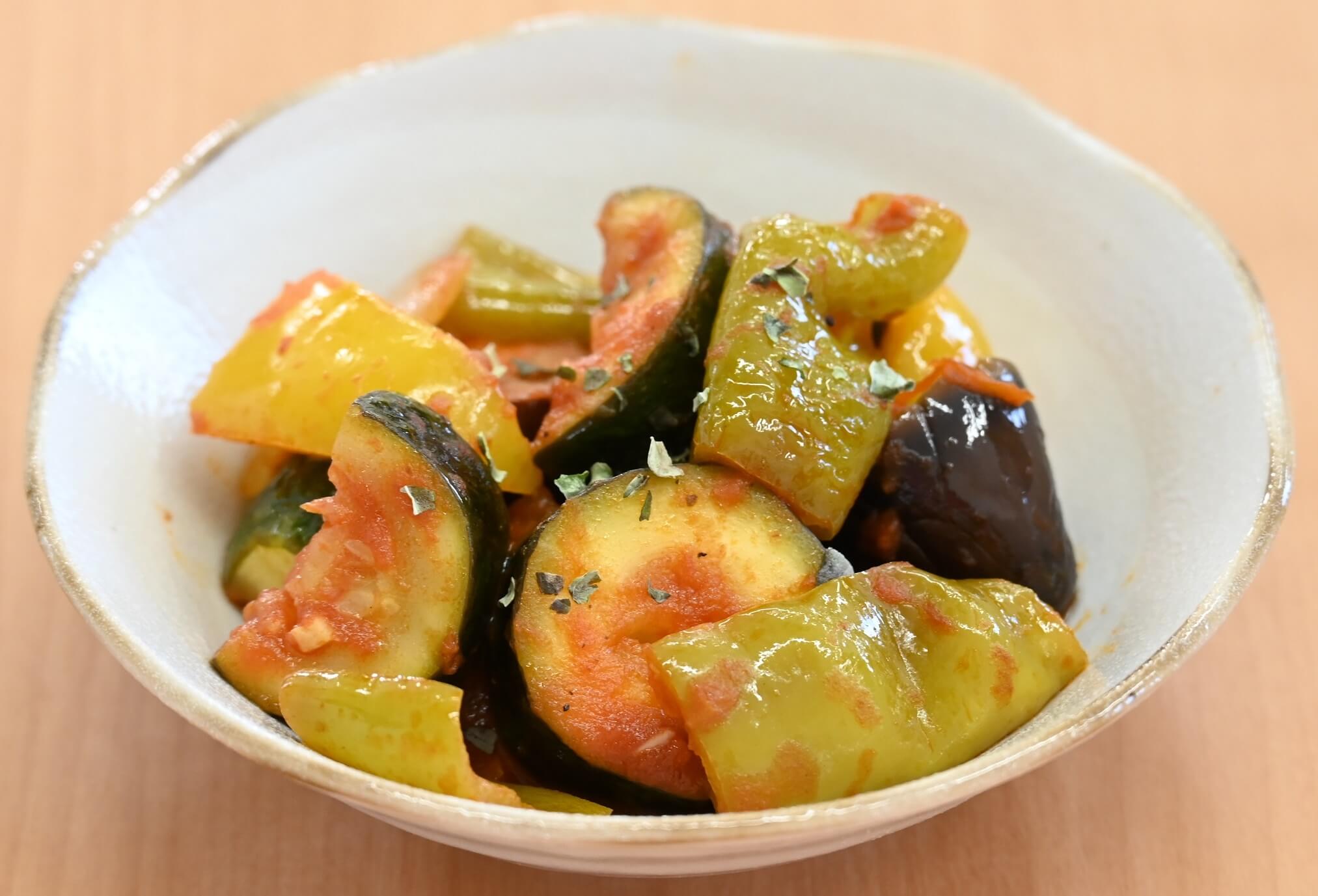 福耳トウガラシは種とワタを除けばそれほど辛くなく、ピーマンよりも風味豊かです。夏野菜のうま味がぎゅっと詰まったラタトゥイユです。